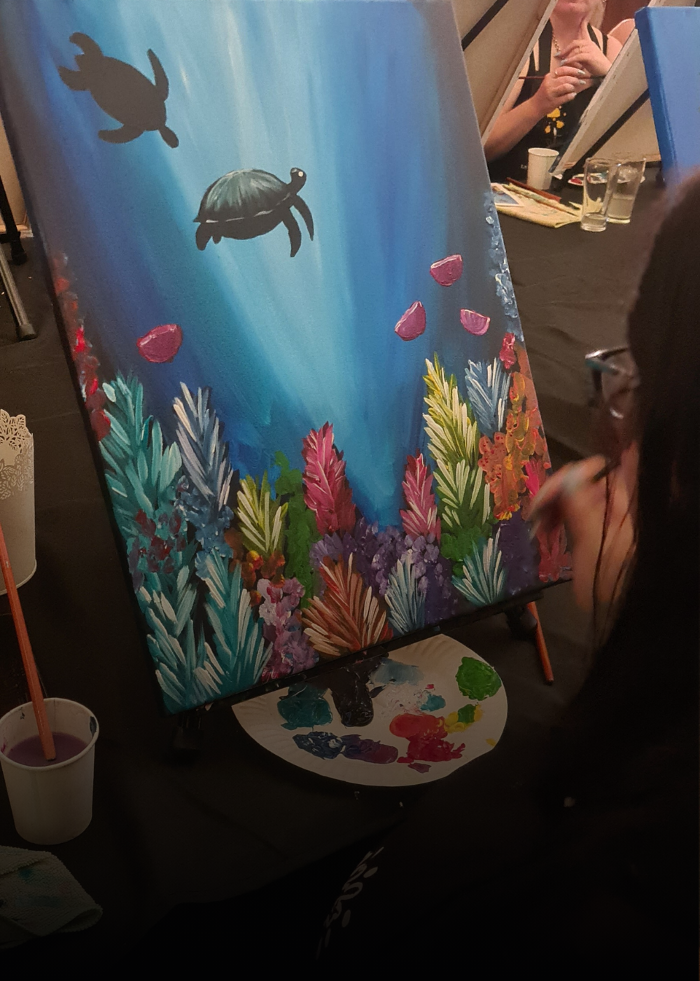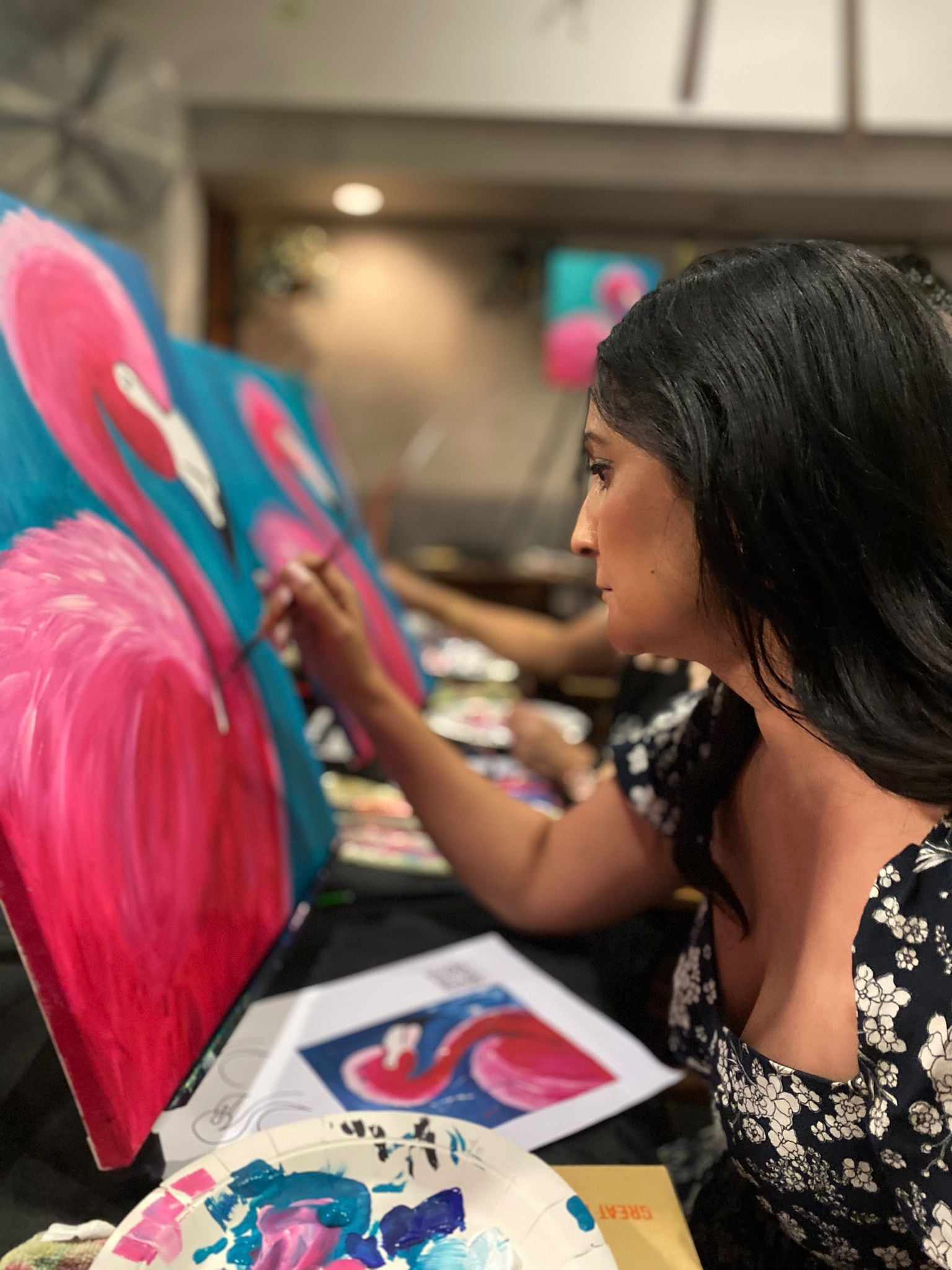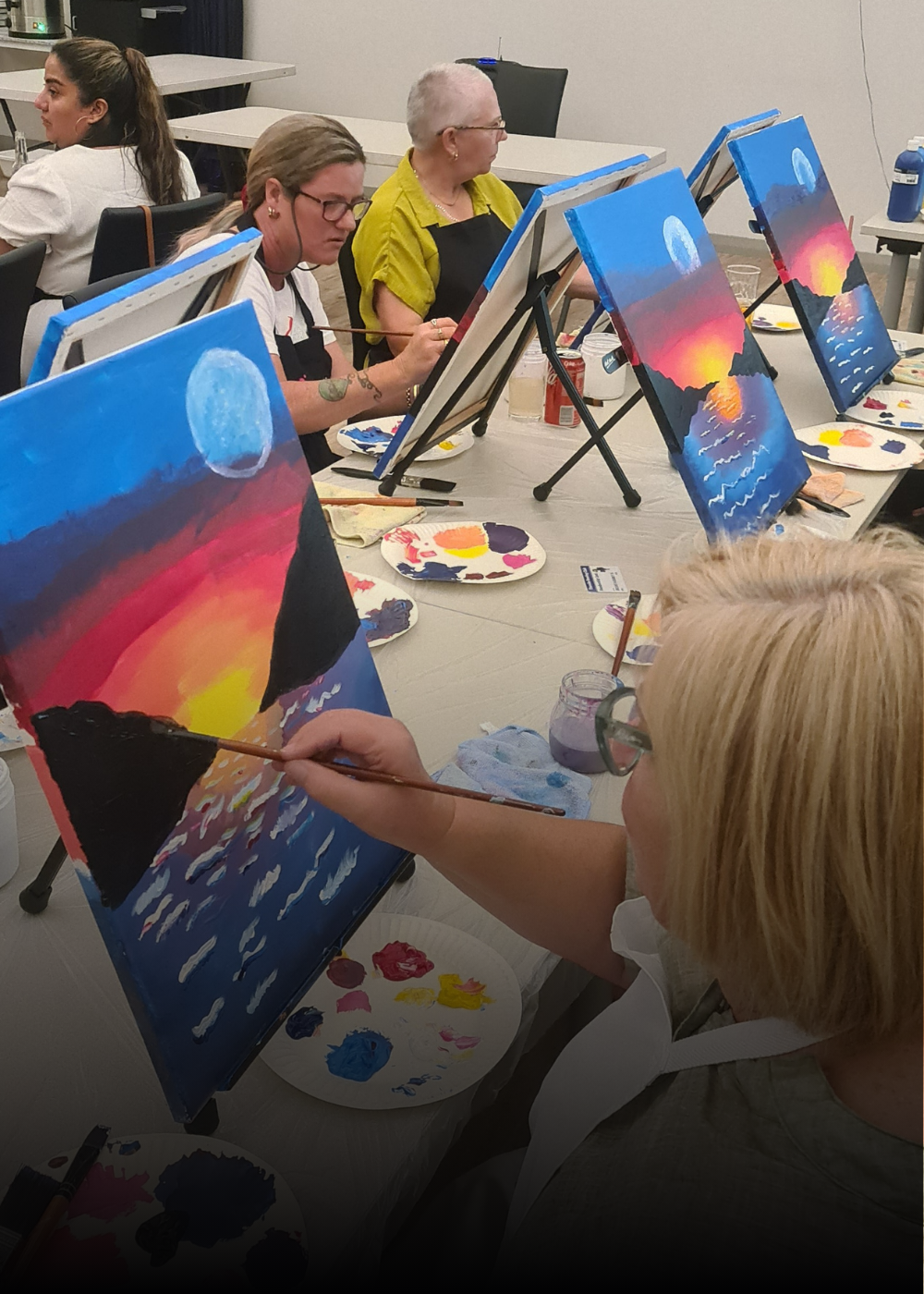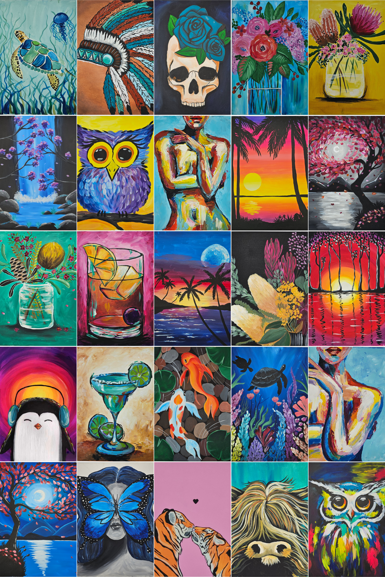 We provide all the essentials—canvas, paints, brushes, aprons, and a playlist of great tunes—to ensure you have everything you need to create your masterpiece.